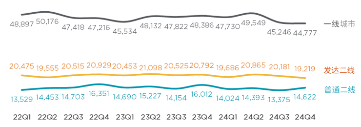 2024年,24个重点城市新建商品住宅销售面积同比下滑了15.5%,成交量萎缩的同时也伴随着整体价格的回落,一线、发达及普通二线城市2024年平均成交均价分别同比下降了2.0%、3.9%和5.2%,降幅较上年均有所扩大。分季度来看,一线城市年内整体均价呈向下趋势,三、四季度新政实施后,伴随城市外围区域限购的解除,以及首付比例的大幅下滑,一线城市刚需类住宅大量成交拉低均价。从量上看,一线城市第四季度成交量环比第三季度大幅上涨60.5%。发达及普通二线城市价格相对平稳,同样在首付比例及利率下降的政策利好下,刚需加速入市,同时改善需求亦有所活跃,第四季度发达及普通二线城市整体均价分别环比下降4.8%和上涨9.3%,结构性因素亦是引起波动的重要原因之一。