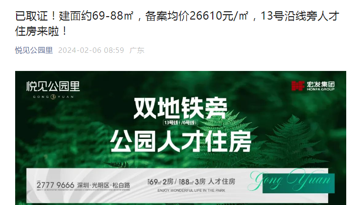 2月6日,宏发悦见公园里项目官方公众号发布房源相关信息,本批363套房源均为可售人人才房,备案均价26610元/㎡,其中约69平两房231套,约88平三房132套,最低总价1,468,095元,预计一季度配售!