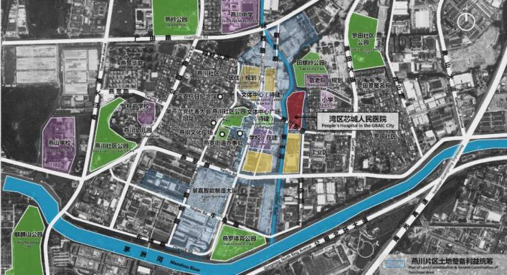 湾区芯城人民医院项目位于宝安区燕罗街道燕川社区内,用地范围位于现状道路燕川东路南北两侧,西侧紧邻罗田河,东侧邻罗田社区。医院项目未来将填补街道医疗资源短板,满足区域居民的基本医疗卫生服务需求,助力片区高水平发展,建设成为“面向世界、引领未来、全国示范”的崭新燕罗。