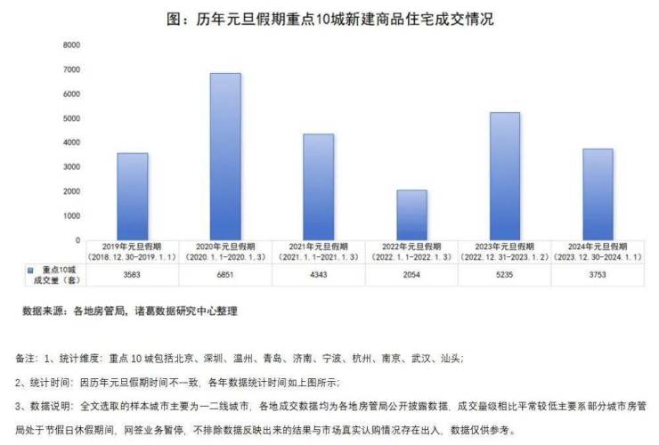 诸葛找房分析认为,2024年元旦假期新房市场整体成交活跃度偏低,成交量不及去年,短期内新房市场仍处于缓慢修复阶段。根据诸葛数据研究中心监测,今年元旦假期重点10城新建商品住宅成交3753套,较去年元旦假期成交量下降28.3%,整体成交量处于近六年元旦期间的偏低水平。