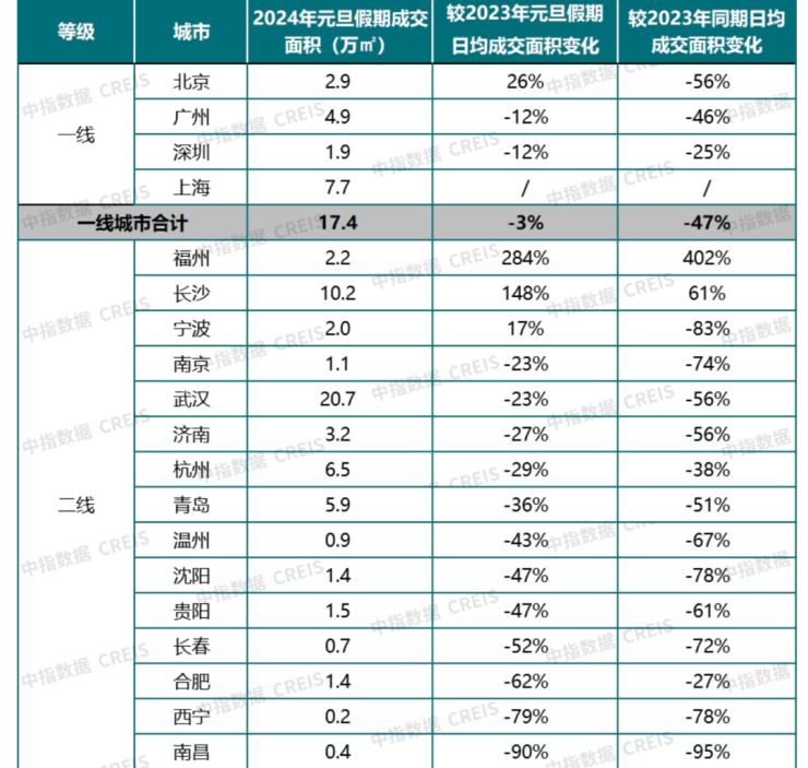 根据中指数据,2024年元旦假期期间(2023.12.30~2024.1.1),40个代表城市日均成交面积较上年元旦假期(2022.12.31~2023.1.2)降幅超两成。