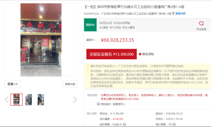 目前,该栋厂房已经重新上架,将于8月26日开拍,截至发稿,已经有3052人次围观。