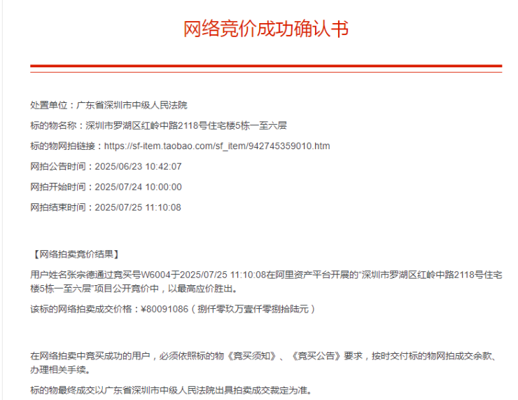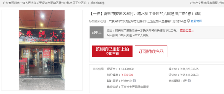 值得一提的是,该标的物抵押给中国光大银行深圳分行,被担保主债权11.5亿元。但拍卖公告中并未明确债务清偿方案。有业内人士分析指出,即便标的成功完成过户,新业主仍可能面临债务追偿风险。