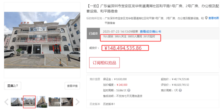 7月22日龙华清湖一处工业厂房+办公楼+宿舍等配套设施(房产证所示面积9484.67㎡)打包法拍,起拍价约4817万元,保证金963万元。