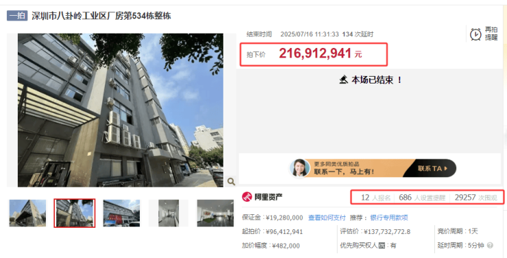 该标的吸引12名土豪报名竞拍、29257次围观,经153轮激烈竞价,最终成交价2.17亿元,溢价率高达125%。