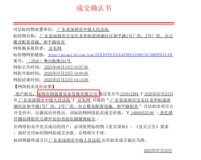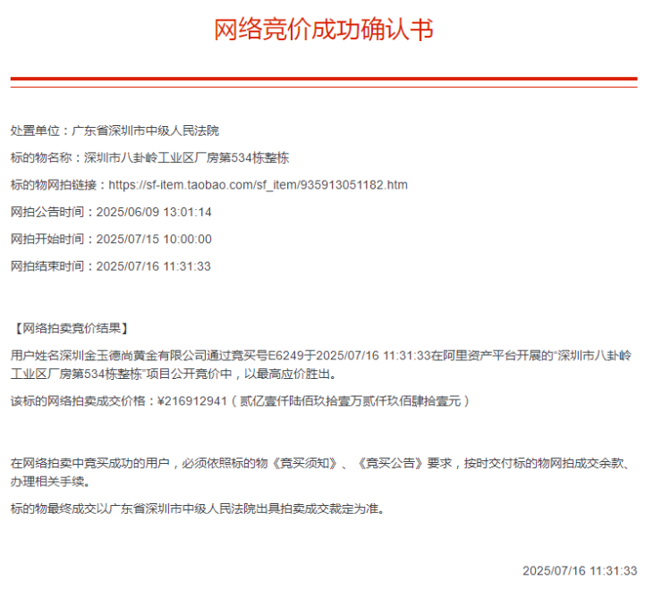 这栋厂房的竞得者是深圳金玉德尚黄金有限公司。