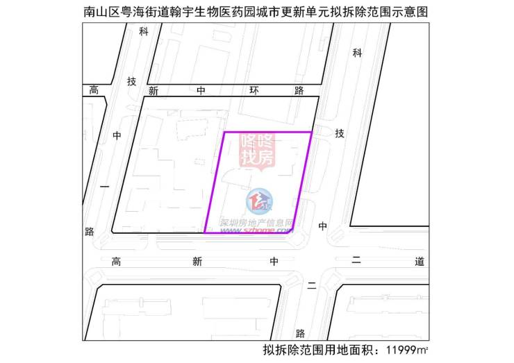 翰宇生物医药园更新项目位于南山区粤海街道,高新中二道与科技中二路交汇处西北侧。项目拆除重建用地面积11999㎡,拟更新方向为新型产业功能。