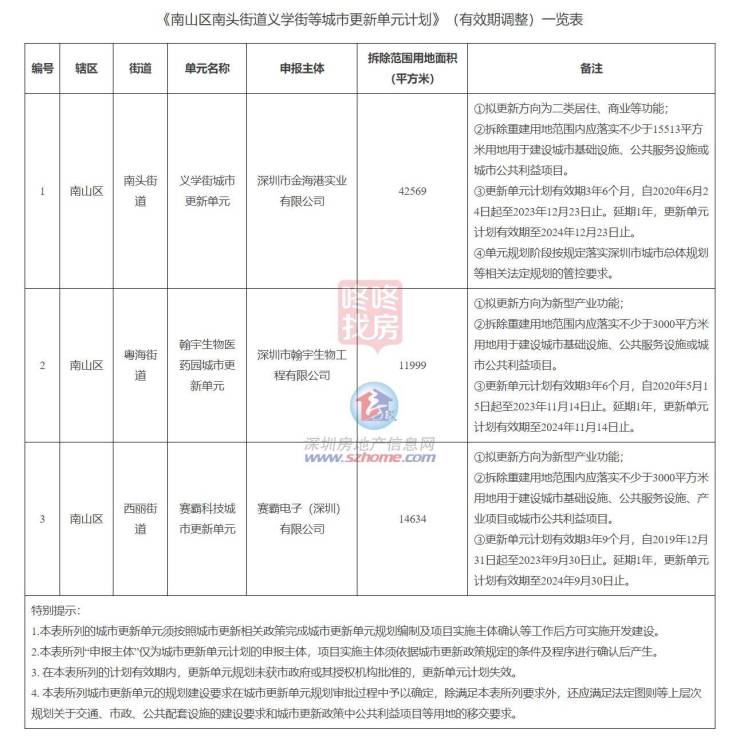 1月29日,南山区城市更新和土地整备局发布补充公告,南头街道义学街、粤海街道翰宇生物医药园、西丽街道赛霸科技城市更新单元计划有效期调整,在原计划有效期基础上延期一年。