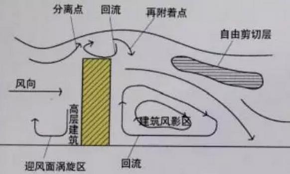 当风迎面吹来时,高层建筑阻挡了风向流动。在和高层建筑碰撞时,一部分风越过顶部和侧边,流向建筑后部,形成建筑风影区。另外一部分风向下流动,风速较快,形成迎风面涡流区。由于高层建筑物较大程度改变了建筑物周围的局地风场,所以易形成大风。