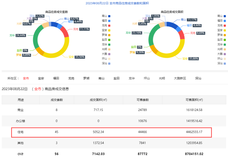 8月22日新房住宅共网签45套。宝安16套;福田2套;龙岗5套;罗湖4套;南山3套;盐田0套;龙华11套;坪山0套;光明3套;大鹏0套;深汕1套。