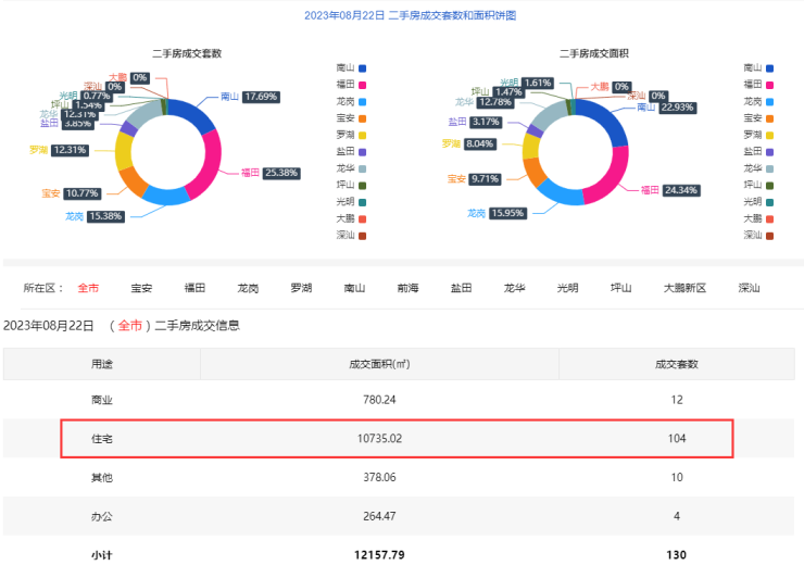 8月22日二手房住宅网签104套。宝安10套;福田25套;龙岗17套;罗湖12套;南山20套;盐田4套;龙华13套;光明1套;坪山2套;大鹏0套。