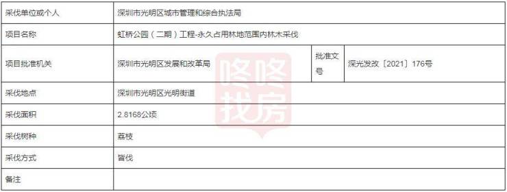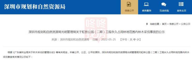 5月25日,深圳市规划和自然资源局光明管理局发布《关于虹桥公园(二期)工程永久占用林地范围内林木采伐事宜的公示》。