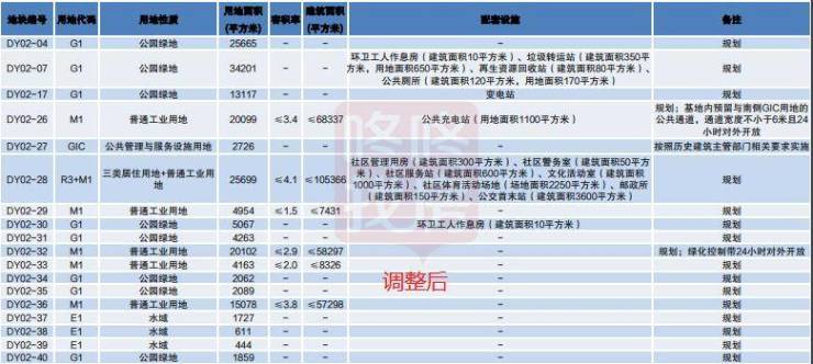 调整DY02-04、DY02-07地块边界,用地面积分别为25665平方米、34201平方米,用地性质维持公园绿地不变,其中DY02-07配套设施为小型垃圾转运站(建筑面积350平方米,用地面积650平方米)、再生资源回收站(建筑面积80平方米)、公共厕所(建筑面积120平方米,用地面积170平方米)、环卫工人作息房(建筑面积10平方米),备注“规划”;