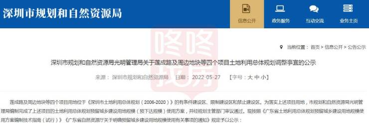 5月27日,深圳市规划和自然资源局光明管理局发布《关于莲成路及周边地块等四个项目土地利用总体规划调整事宜的公示》。