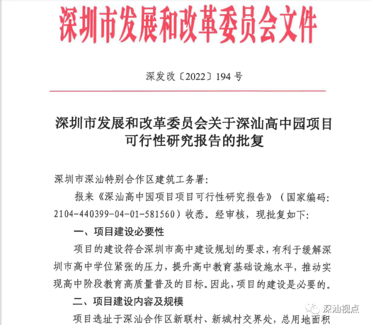 今年4月,深圳市发展和改革委员会正式批复《深汕高中园项目可行性研究报告》,项目批复总投资32.2亿元。