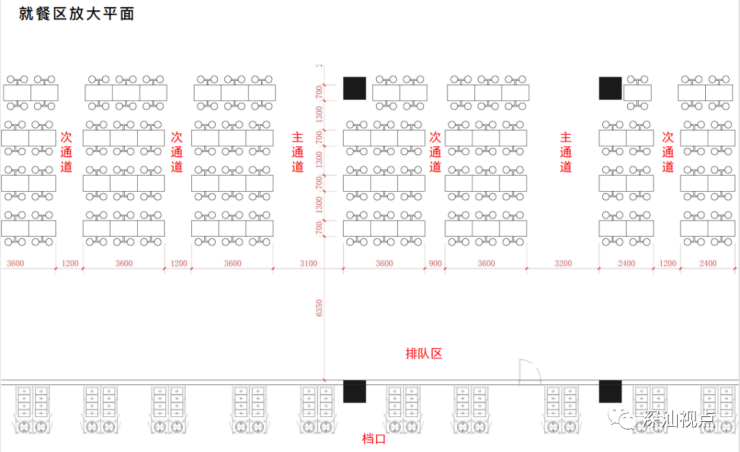 食堂方面,设计每个食堂面积4950平方米,根据校方分批就餐的管理模式共计2550人(学生2400人,教师150人)的食堂座位布局方案。