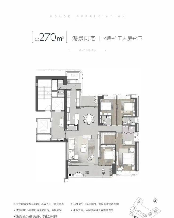 270平海景楼王大户型约13.4-14.9万/平,总价范围约3633-4011万。