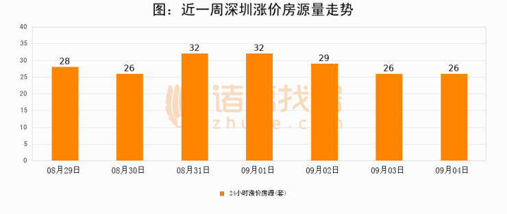 根据诸葛找房数据显示,深圳24小时涨价房源量为26套,较09月03日持平。