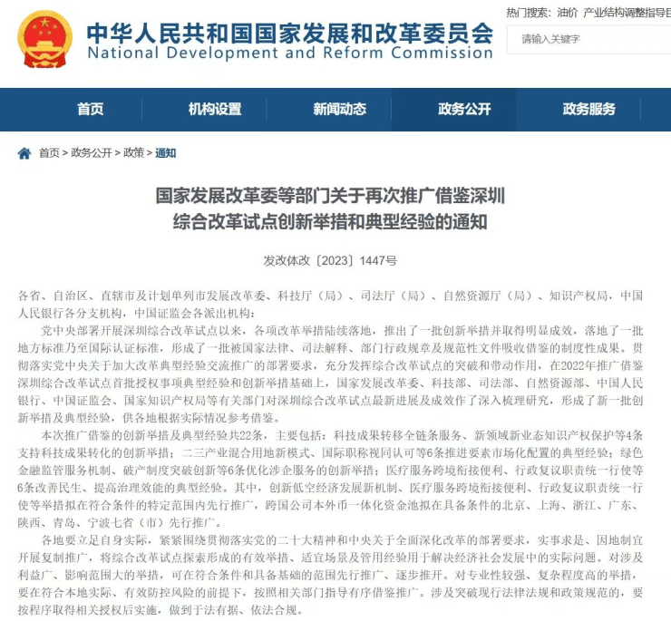 11月16日,国家发展改革委、科技部、司法部、自然资源部、中国人民银行、中国证监会、国家知识产权局等有关部门印发《国家发展改革委等部门关于再次推广借鉴深圳综合改革试点创新举措和典型经验的通知》,在2022年推广借鉴深圳综合改革试点首批授权事项典型经验和创新举措基础上,再次推广借鉴深圳综合改革试点22条创新举措及典型经验,供各地根据实际情况参考借鉴。