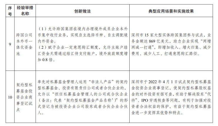 本次推广借鉴的创新举措及典型经验共22条,主要包括:科技成果转移全链条服务、新领域新业态知识产权保护等4条支持科技成果转化的创新举措;二三产业混合用地新模式、国际职称视同认可等6条推进要素市场化配置的典型经验;绿色金融监管服务机制、破产制度突破创新等6条优化涉企服务的创新举措;医疗服务跨境衔接便利、行政复议职责统一行使等6条改善民生、提高治理效能的典型经验。其中,创新低空经济发展新机制、医疗服务跨境衔接便利、行政复议职责统一行使等举措拟在符合条件的特定范围内先行推广,跨国公司本外币一体化资金池拟在具备条件的北京、上海、浙江、广东、陕西、青岛、宁波七省(市)先行推广。