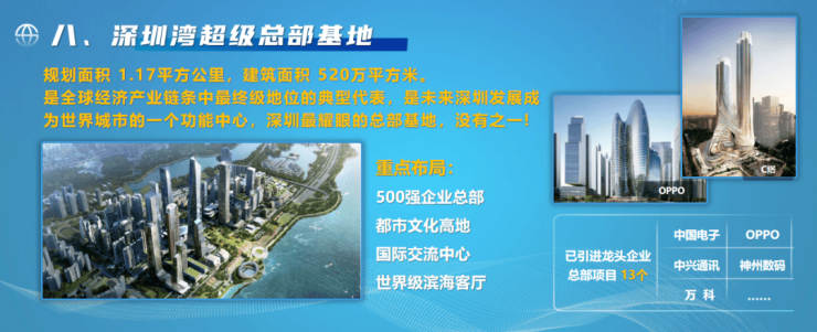 后海、前海、深圳湾等产业空间,将重点发展产品与服务创新、总部经济、科技金融、商务服务、海洋科技、文化创意和现代物流等多功能领域,构建创新驱动的总部经济集群。