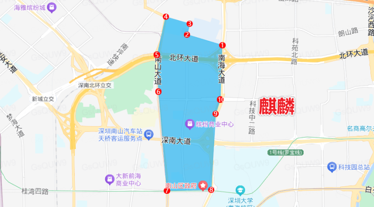 《南山区规划纲要》公布了十大重点发展片区,分别为西丽湖国际科教城、留仙洞战略性新兴产业总部基地、西丽高铁新城、高新区北区、南山创新大道、后海金融商务总部基地、蛇口国际海洋城、深圳湾超级总部基地、深圳湾文化走廊、支持前海深港现代服务业合作区发展。