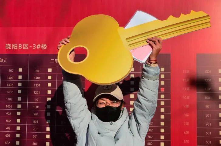 2023年11月18日,山东青岛。一名业主开心地举起钥匙模型。(图/IC)