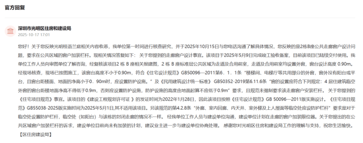 关于留言市民提到的走廊窗户设计事宜:该项目于2025年5月9日完成竣工验收备案,目前该项目已陆续交付使用。光明区住房建设局工作人员向审图单位了解咨询,经复核该项目2栋B座相关报建图,2栋B座标准层公共区域为走道及合用前室,走道及合用前室均设置外窗,窗台设计高度0.90m。经现场核查,现场已按图施工,该窗台高度不小于0.90m,符合《住宅设计规范》GB50096—2011第6.1.1条“楼梯间、电梯厅等共用部分的外窗,窗外没有阳台或平台,且窗台距楼面、地面的净高小于0.90m时,应设置防护设施。”及《民用建筑设计统一标准》 GB50352-2019第6.11.6条“窗的设置应符合下列规定:居住建筑临空外窗的窗台距楼地面净高不得低于0.9m,否则应设置防护设施,防护设施的高度由地面起算不应低于0.9m”要求,且规范未强制要求该走廊窗户安装栏杆。
