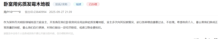 记者检索发现,在人民网留言板平台,近期有3条关于该项目的投诉,均指出相同的质量问题与安全隐患。留言中,有业主提出希望免费拆除地板,更换为瓷砖,或赔偿业主自行更换地板的经济损失。