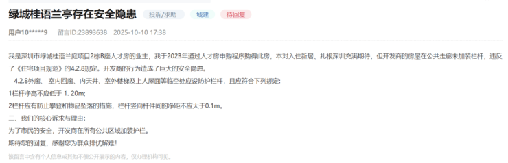关于部分公区窗户未装栏杆的问题,记者获悉,10月15日,区住建局已联系相关业主,表示符合住宅规范标准,且开发商按照设计施工,不存在违规行为。