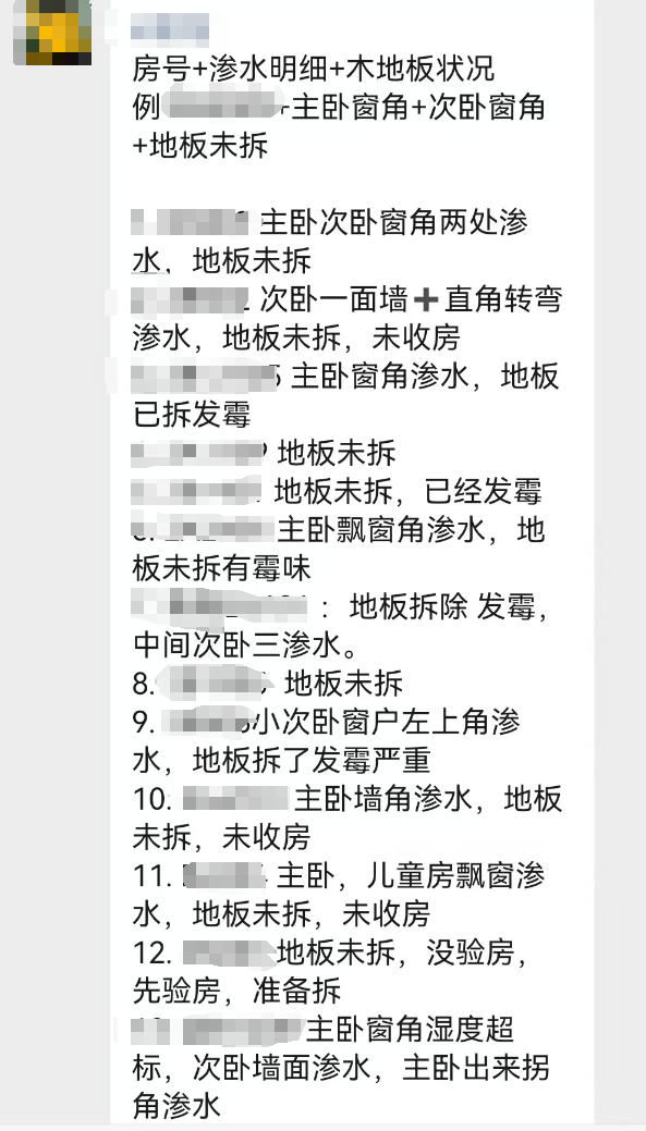 一位业主许先生(化名)提供的截图显示,反馈渗水、木地板发霉等问题的业主不在少数。有的业主已收房,并选择自行更换地板,同时仍有不少业主未收房,等待处理结果。“很多人着急入住,就无奈收房了,自己把有霉菌的地板换了。”