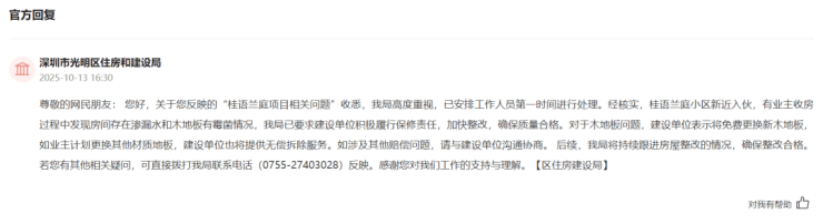 10月13日,光明区住房建设局回应表示,经核实,桂语兰庭小区新近入伙,有业主收房过程中发现房间存在渗漏水和木地板有霉菌情况,已要求建设单位积极履行保修责任,加快整改,确保质量合格。对于木地板问题,建设单位表示将免费更换新木地板,如业主计划更换其他材质地板,建设单位也将提供无偿拆除服务。