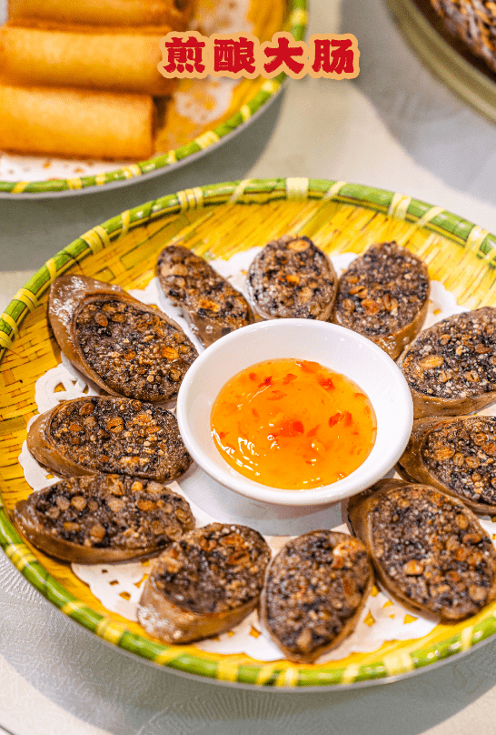 根哥说煎酿大肠也是源于他小时候吃奶奶做的大肠,至今记忆深刻。故而,结合顺德菜式创新升级,将糯米和花生豆类等食材酿入大肠里,经过煲、煮、煎多道工序,才有这道外脆里糯的煎酿大肠。酿大肠切成厚片入锅香煎,外皮微酥,嚼劲十足,内馅饱满,软糯香脆。