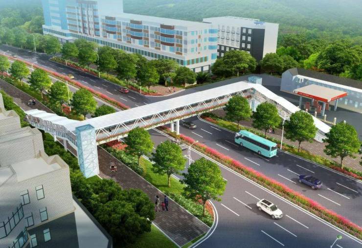 位于龙华区福城街道观光路观澜科技园南门,横跨观光路的富士康路段。天桥为钢箱梁结构,全长60.6米、宽6.2米,梯道共2处、宽4米,桥梁投影总面积608平方米,设置两部无障碍电梯。