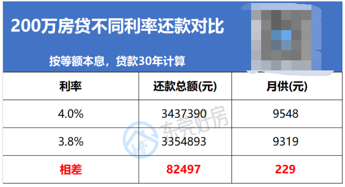 而按照200万房贷、贷款30年等额本息计算,相比之前普遍的4.0%,现在3.8%的利率,月供少了229元,总利息少了82497元。