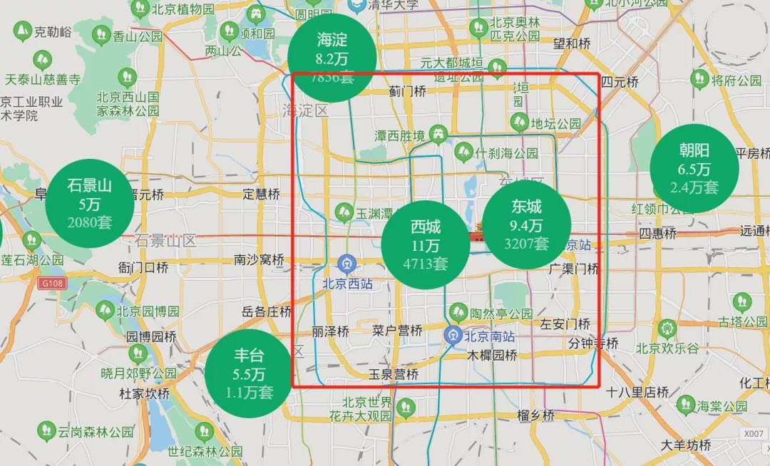 北京地铁2号线(内环线)圈起的是北京整体房价最贵两个区域,其中东城参考价11万/平,西城9.4万/平,两个区的二手房挂牌量加起来不到8000套。