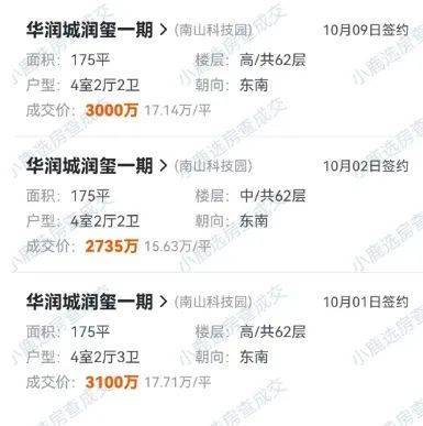 10月1日至9日,华润城润玺一期成交了3套房源,均为175㎡的大户型房源,成交非常活跃。
