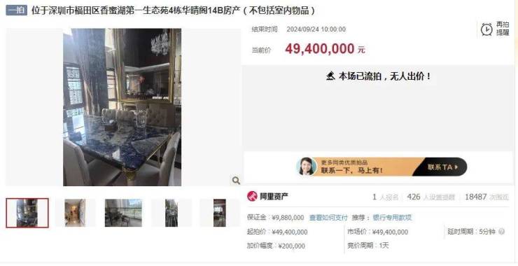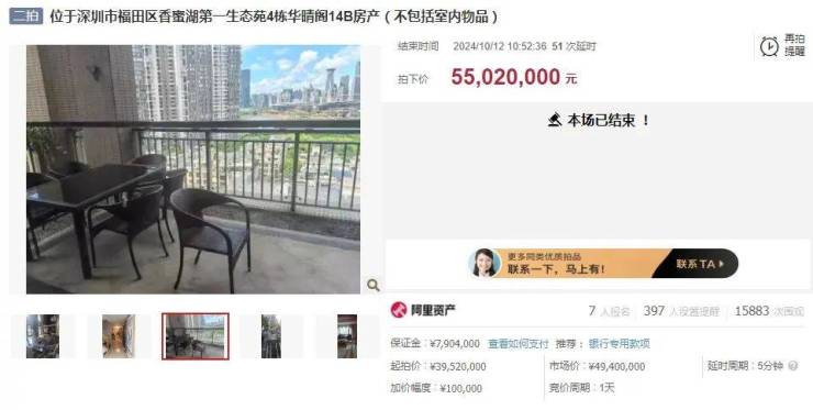 10月12日,香蜜湖第一生态苑,即大家熟知的香蜜湖壹号,一套约330㎡的复式二拍成功拍出。