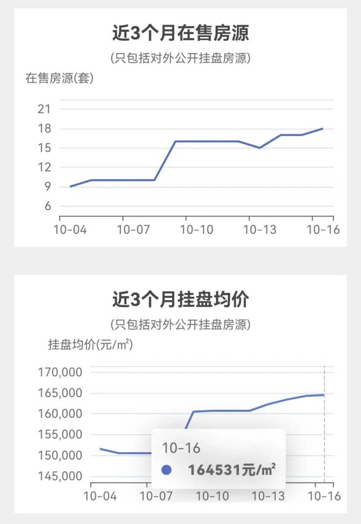 新政后该小区的挂牌量和挂牌价也是一路攀升,挂牌均价在16万+/㎡,目前看来朝向较好的高楼层房源,市场成交价能达到这个梯队。
