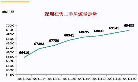 根据公开在售二手房源量数据统计,2024年11月25日,全市共有69,438套有效二手房源在售,较上周增加297套。其中福田较上周增加110套,有效在售10,231套,罗湖较上周增加74套,有效在售9,195套,龙岗较上周增加69套,有效在售18,439套。