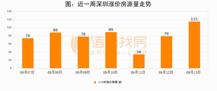 根据诸葛找房数据显示,深圳24小时涨价房源量为115套,较09月12日增加36套,环比上涨45.6%。与此同时,涨价房源占比小幅扩大,业主信心有所提升。