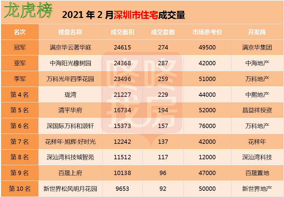 根据深圳房地产信息网的监测,满京华云著华庭2月以24615平方米/274套取得了2月深圳市成交量冠军,市场参考价49500元/平方米;中海阳光橡树园2月成交24368平方米/287套,位居亚军,市场参考价42000元/平方米;万科光年四季花园2月成交23496平方米/259套,位居季军,市场参考价51000元/平方米。