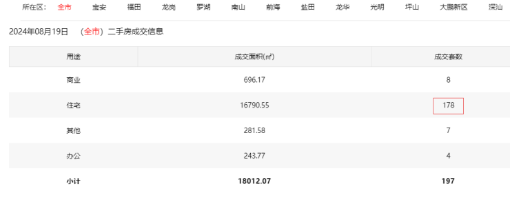 2024年8月19日二手房住宅网签178套。宝安16套;福田46套;龙岗42套;罗湖28套;南山26套;盐田2套;龙华12套;光明2套;坪山2套;大鹏2套。