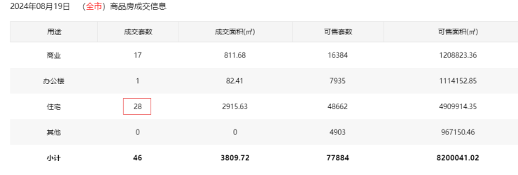 2024年8月19日新房住宅共网签28套。宝安12套;福田2套;龙岗2套;罗湖6套;南山1套;盐田0套;龙华3套;坪山0套;光明2套;大鹏0套;深汕0套。