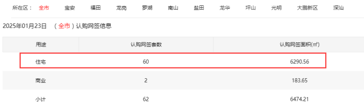 2025年1月23日新房住宅认购网签60套。其中,宝安4套;福田0套;龙岗40套;罗湖3套;南山0套;盐田1套;龙华1套;坪山5套;光明6套;大鹏0套;深汕0套。
