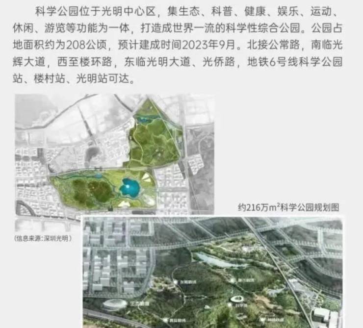 旁边就是光明中心区的重点工程——科学公园,科学公园未来集生态、科普、健康、娱乐、运动、休闲等功能于一体,打造成世界一流的科学性综合公园。