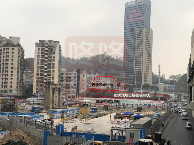 其中,赣深高铁安置房目前用滤网覆盖着,园美地二块住宅地还未动工,嘉信云峰公馆二期目前还没有拆。