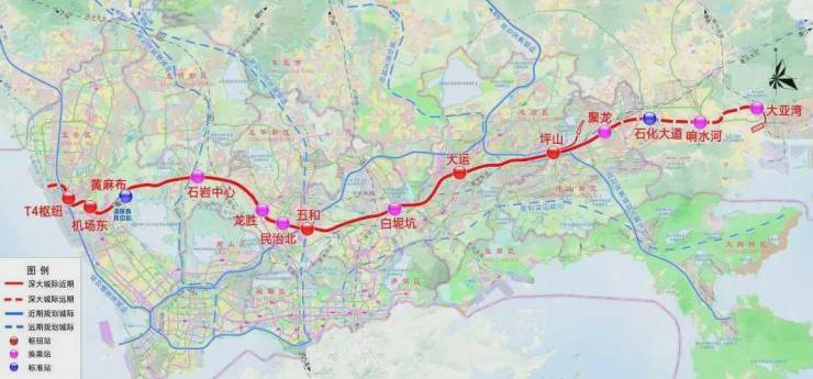 地铁16号线:已开通运营,连接龙岗与坪山,设站24座,强化东部区域内部联系。