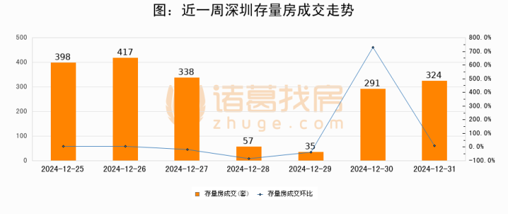 从存量房来看,2024年12月31日深圳存量房单日成交324套,比昨日增加33套,环比上涨11.3%。从近一周存量房成交来看,深圳存量房日均成交套数为265套,12月31日单日成交324套,高于近一周平均水平22.3%。