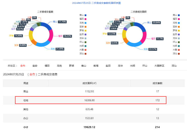 2024年7月25日二手房住宅网签172套。宝安18套;福田25套;龙岗37套;罗湖26套;南山29套;盐田10套;龙华16套;光明2套;坪山9套;大鹏1套。